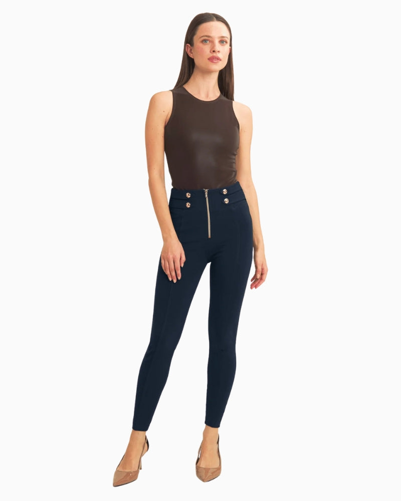 These WR.UP® pants in midnight navy from Freddy are a brilliant mix of sculpting comfort and smart, tailored styling. Designed with a flattering high waist and finished with chic gold military-style buttons, they offer both support and style in one sleek piece.