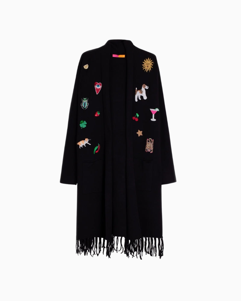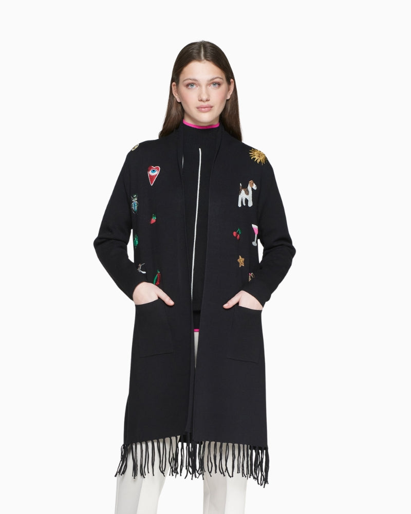 Long black cardigan with multicolour embroidery on the front