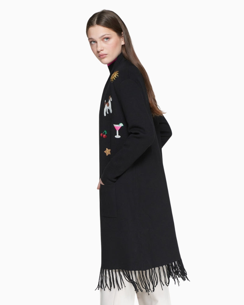 The Black Embroidered Cardigan from Vilagallo is a statement knit that combines comfort with eye-catching detail. Crafted in a soft, medium-weight viscose blend, it features multicoloured decorative embroidery across the front for a vibrant finish. The straight, open-front design with a shawl collar makes it easy to layer, while the fringed hem adds a playful boho-inspired edge. Finished with practical patch pockets, it’s a versatile piece that works just as well over jeans and a tee as it does layered with dresses.