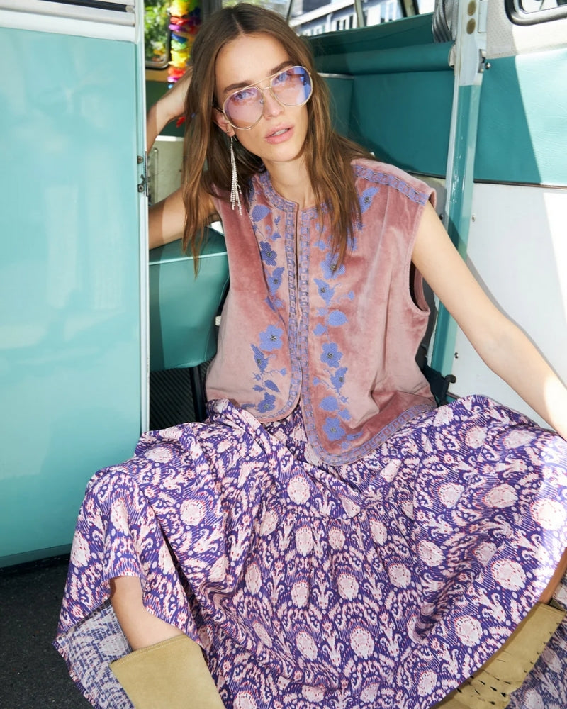 The Bin Velour Vest from Lollys Laundry is a beautifully soft layering piece with a handcrafted feel. Made from cotton velour, it has a gentle texture that feels comfortable while adding depth to your outfit. The relaxed silhouette with rounded edges frames the detailed embroidery on both the front and back, giving it a feminine, artistic look. Easy to layer over shirts, tees or dresses, it brings personality to simple everyday outfits.