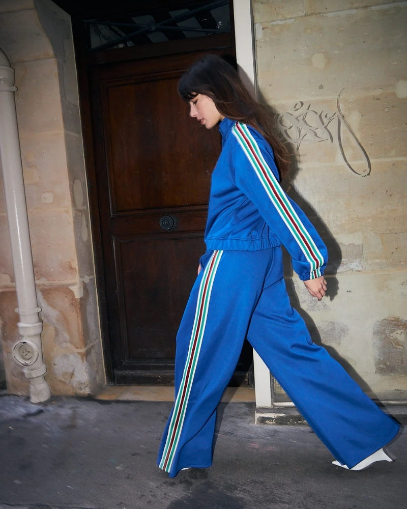 The Liam Pants from Lollys Laundry are a relaxed, easy-to-wear style with a sporty twist. Designed in a soft, stretchy fabric, they feature the familiar Liam fit with wide legs and a comfortable elasticated waist. The colourful stripe detailing down the sides adds a fresh, athletic feel to the blue base. Ideal for everyday wear, they also pair perfectly with the matching Brooklynn jacket for a standout co-ordinated look.