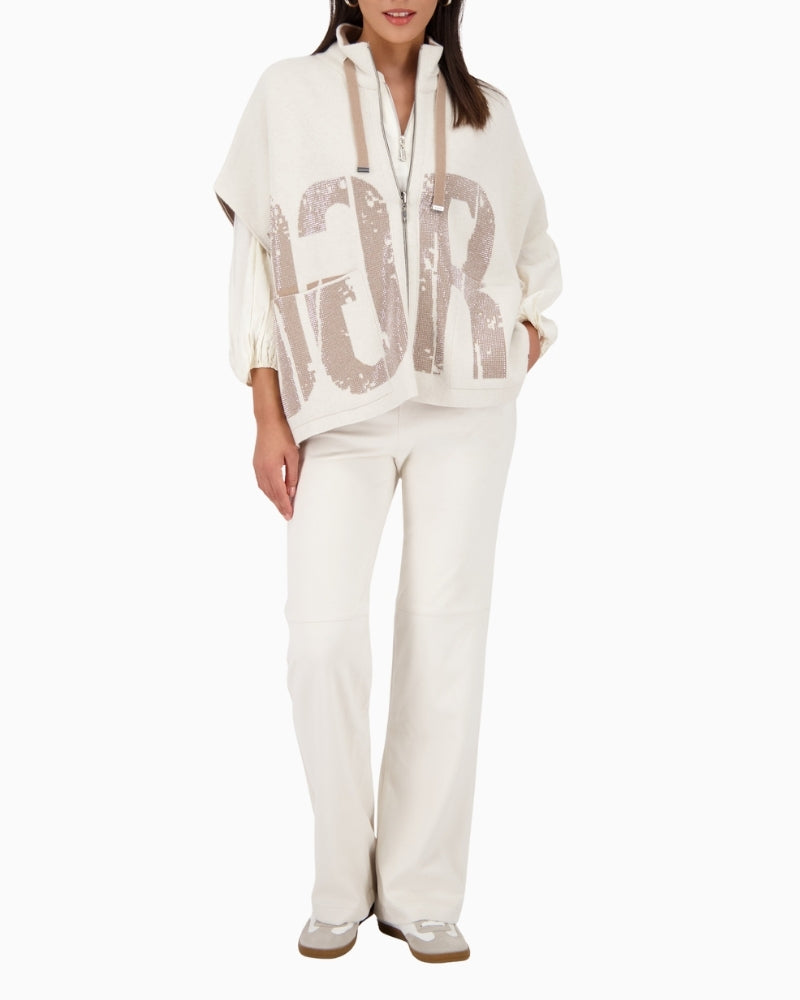 This reversible jacket from Monari is a real standout piece. Made from a luxurious wool-viscose blend, it has a soft feel and a modern oversized cut. The jacquard pattern gives it texture and interest, while subtle rhinestones add a touch of sparkle. Finished with a stand-up collar and tie detail, short sleeves, and patch pockets, it’s both practical and stylish.