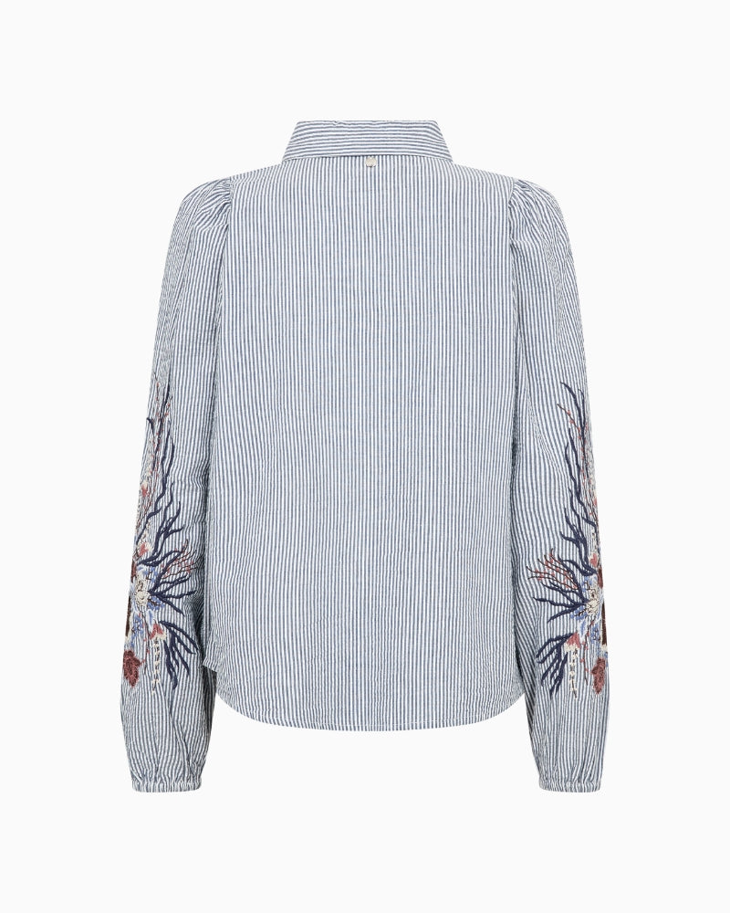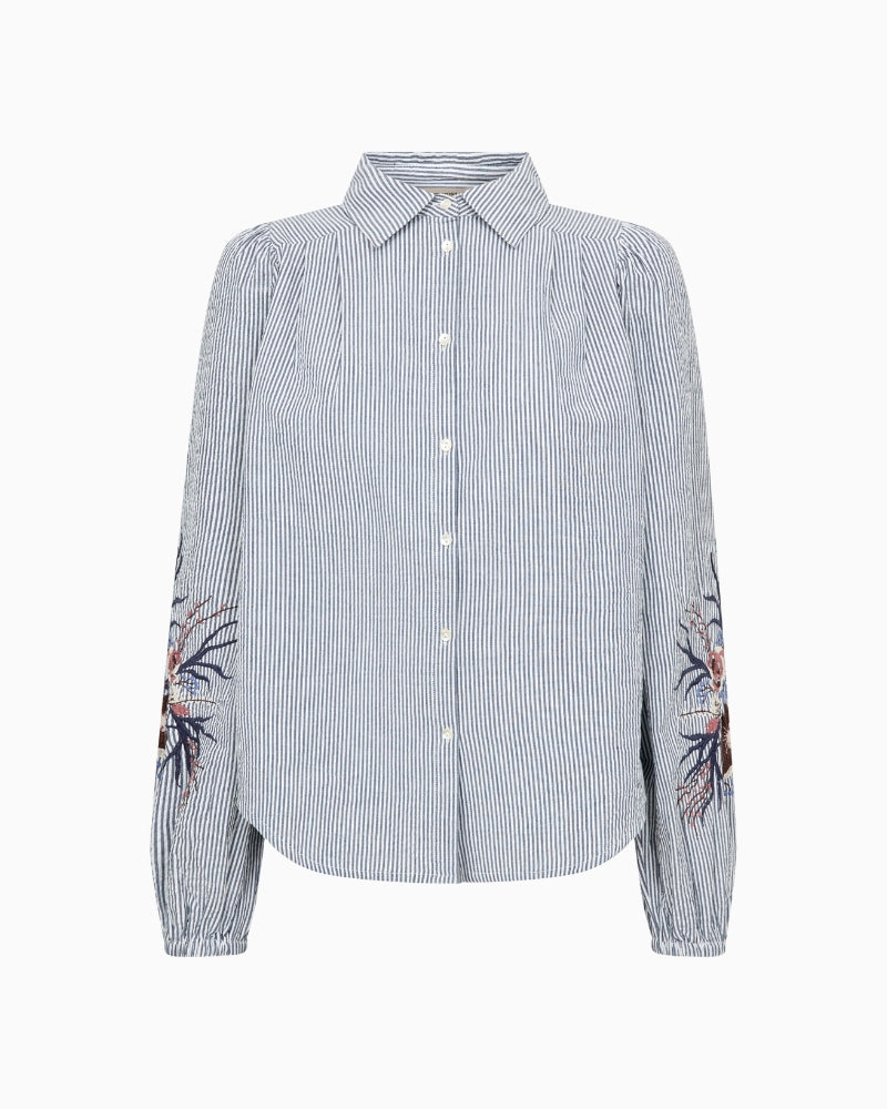 The Mos Mosh Ciu Oxfo Shirt is a fresh and feminine take on a classic striped blouse. Crafted from 100% cotton, this shirt offers a crisp yet lightweight feel that is perfect for everyday wear. Designed with a flattering V-neckline and full button-through front, it is elevated by delicate ruffle detailing at the shoulders for a soft, modern touch. The vertical stripe pattern enhances the silhouette, making this shirt both timeless and effortlessly stylish.