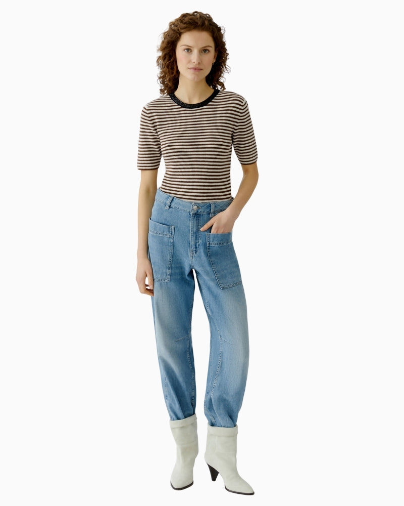 This Oui half-sleeve pullover is a smart, wearable knit with a sporty edge. Knitted from pure cotton, it feels soft and breathable on the skin. The ribbed stripe design keeps it casual, while the contrast yarn and fine mini sequins around the neckline add a subtle lift. Cut in a narrow fit with a slightly shorter length, it sits neatly on the body and works well for everyday outfits that need a little polish.