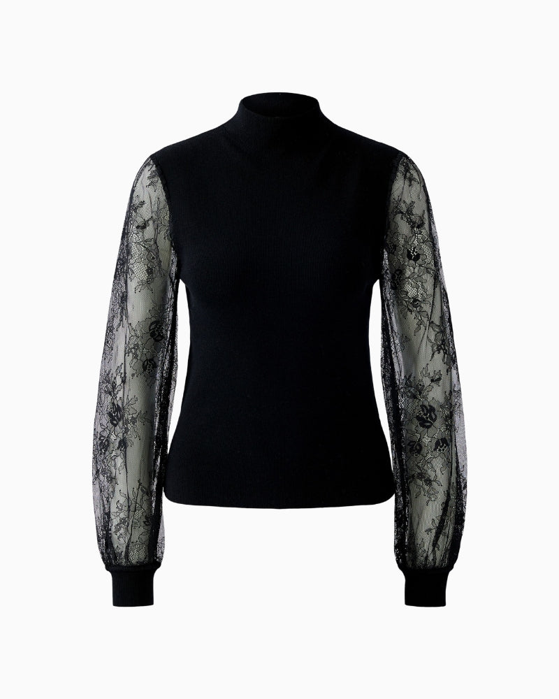This gorgeous pullover by Oui brings a dressy feel to your everyday knitwear. With a slim, slightly cropped shape, it pairs a soft knit body with striking sheer lace balloon sleeves. The stand-up collar and ribbed cuffs give it a polished finish, while the floral lace adds a subtle, feminine touch. It’s a handy go-to when you want to look put-together but still feel comfortable.