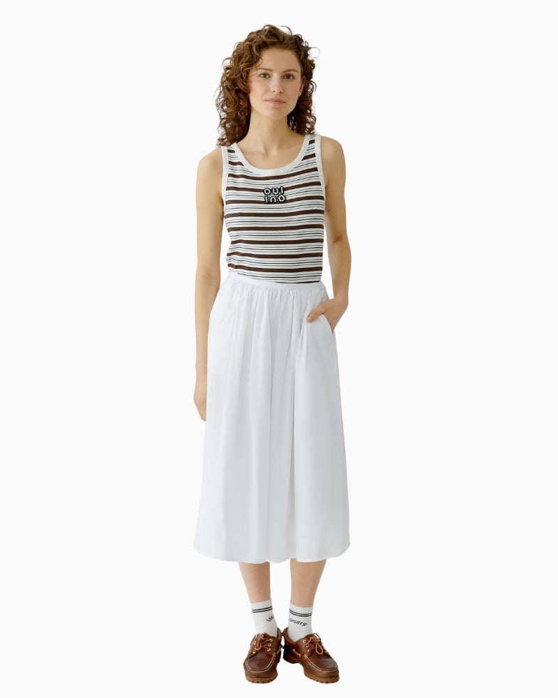 This Oui tank top is a refined take on an everyday essential. Made from a super-soft cotton and modal blend, it feels smooth and comfortable on the skin with plenty of stretch. The slim fit and regular length create a clean, flattering line, while the ribbed fabric with subtle stripe design adds quiet detail. Finished with a hand-sewn pearl logo at the chest, it’s an easy piece that feels a little more special than a basic vest.
