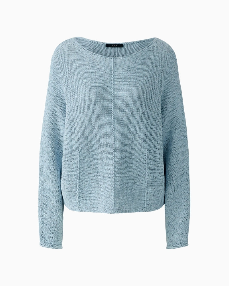 This Oui ribbon yarn pullover is a modern, easy-to-wear knit with a relaxed feel. Knitted horizontally from a soft cotton-blend ribbon yarn, it has a light, textured finish that sits comfortably on the body. The casual cut and cropped length give it a fresh shape, while the subtle knitted dart details add gentle structure. Finished with a soft submarine neckline and rolled edges, it’s an ideal everyday layer.