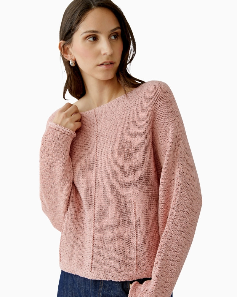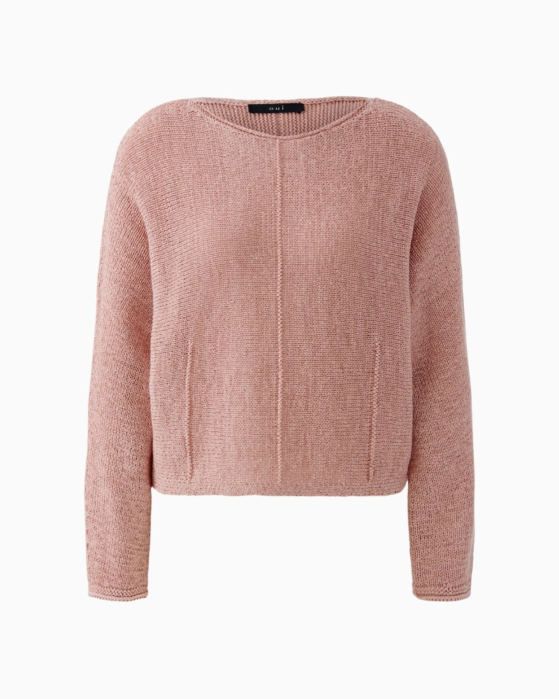 This Oui ribbon yarn pullover is a modern, easy knit with a relaxed, wearable shape. Knitted horizontally from a soft cotton-blend ribbon yarn, it has a light, textured feel that sits comfortably on the body. The casual cut and cropped length give it a fresh look, while the subtle knitted dart details add gentle shaping. Finished with a soft submarine neckline and rolled edges, it’s a simple piece that works well for everyday wear.