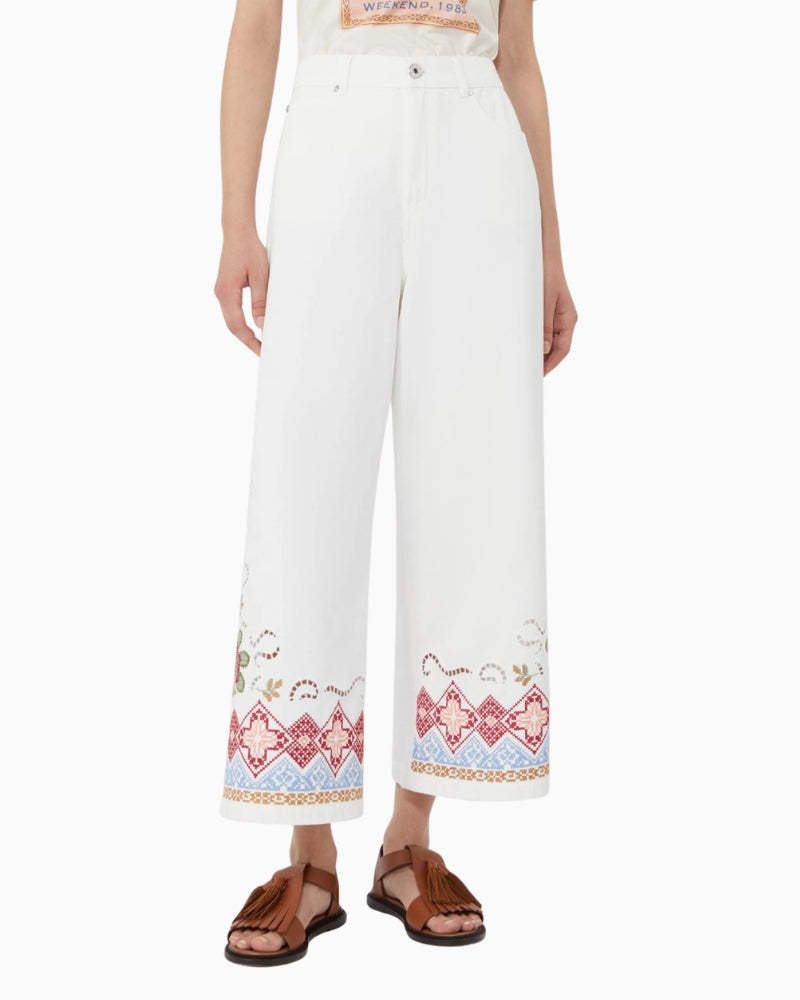 These Weekend Max Mara Adunco trousers are cut from structured yet breathable cotton for a clean, polished look. Designed with a regular fit through the waist and hip, they fall into a wide cropped leg that feels modern and easy to wear. The classic five-pocket styling keeps them practical, while subtle embroidery at the front hem adds a thoughtful finishing touch.