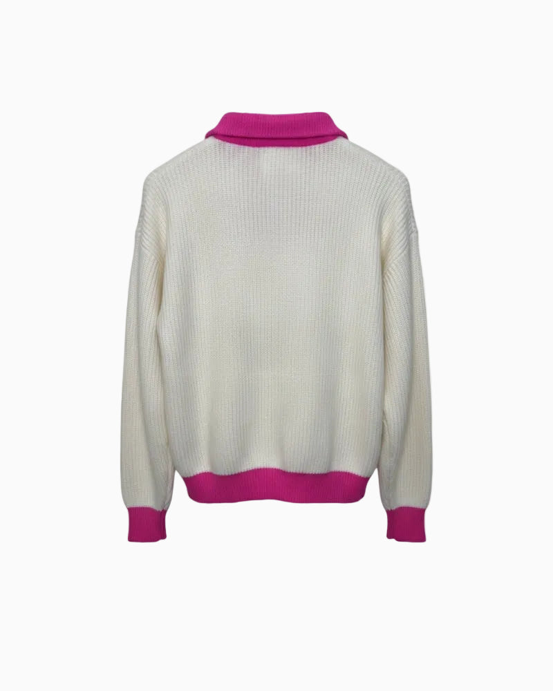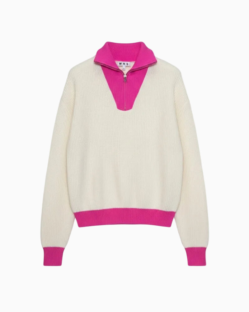 A warm, easy sweater with a soft trucker-style zipped neckline and a relaxed shape that’s lovely to pull on. The Breckenridge II mixes a creamy white knit with vibrant pink trims for a cheerful finish. Crafted in a gentle raccoon-blend yarn, it feels soft on the skin and gives comfortable warmth without bulk. A simple, laid-back layer for cooler days.
