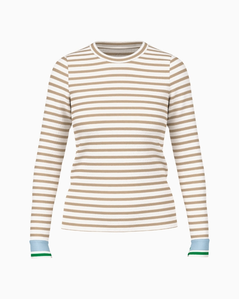 This Marc Cain long sleeve shirt is a timeless everyday essential with a clean, modern look. Crafted from a soft cotton stretch fabric, it offers a comfortable, close-to-the-body fit while remaining flexible and easy to wear. The classic beige and white stripe design gives it a fresh, casual feel, while the refined cuffs with contrast detailing add a subtle Marc Cain signature touch. Perfect for relaxed outfits or effortless layering.