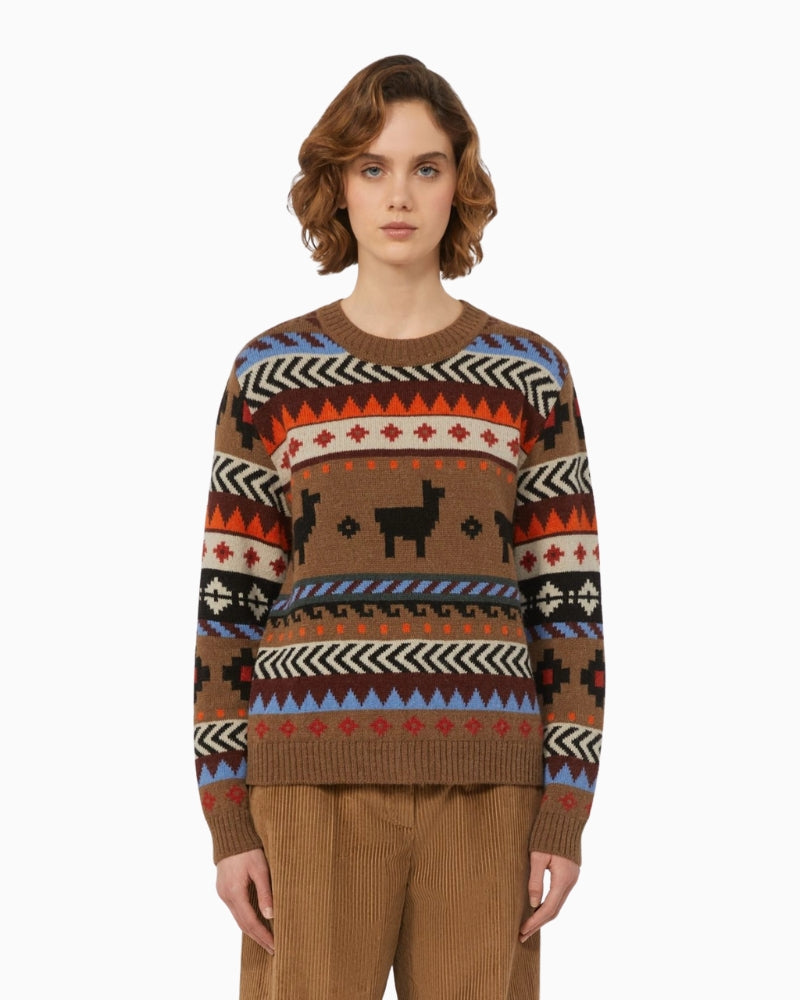 A cosy, eye-catching jumper from Weekend Max Mara, this piece is crafted in a soft wool and alpaca blend with a striking jacquard pattern. It’s warm without being bulky, making it a great option for layering on chilly days.