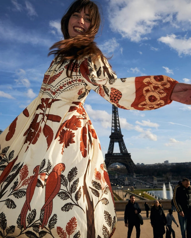 A front button closure with fabric-covered buttons runs through the centre, while the long sleeves add gentle volume to the shape. The flowing maxi length enhances the relaxed, feminine feel of the design.