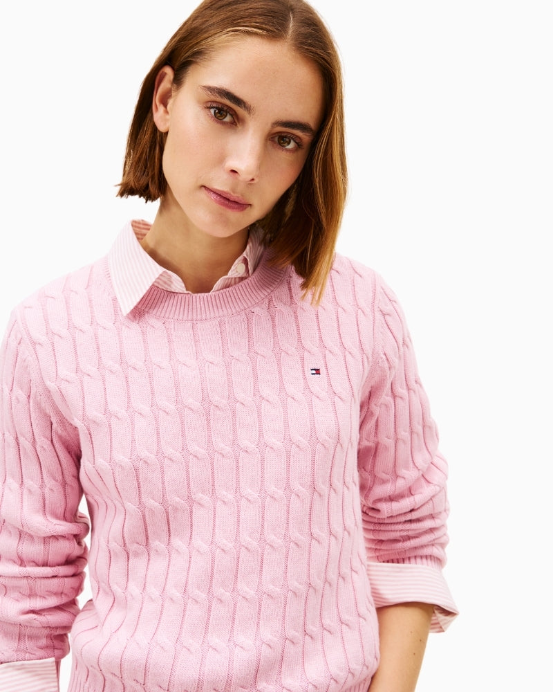 This baby pink cable knit jumper from Tommy Hilfiger is as cosy as it is timeless. Made from pure combed cotton, it's soft on the skin and perfect for layering across the seasons. The mid-gauge knit adds lovely texture, while the classic fit and gentle colour make it an easy pick for day-to-day wear.
