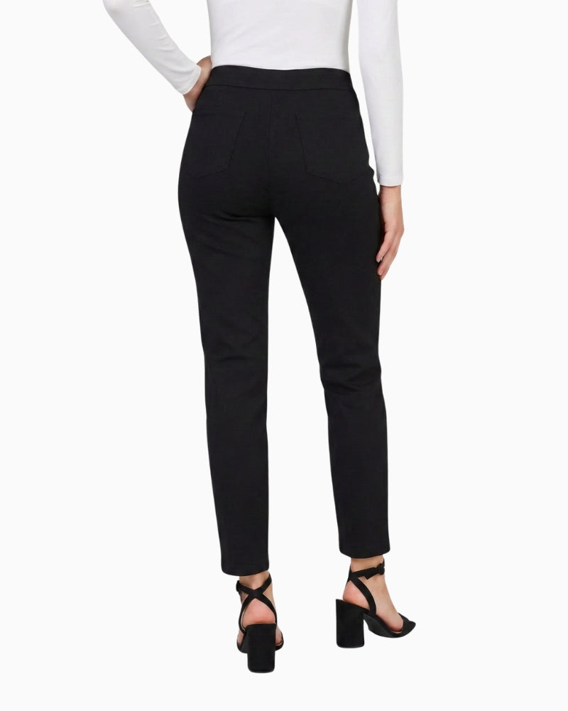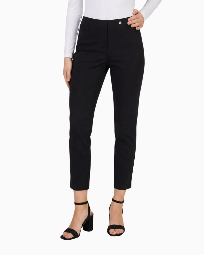 The Bella 09 trousers from Robell are a straight-leg ankle style made in a lightweight stretch fabric for easy, all-day comfort. The wide elastic waistband sits smoothly at the waist, offering pull-on ease without bulk. Designed with practical back pockets and subtle mock fly detail, they give a neat, polished look while staying comfortable.