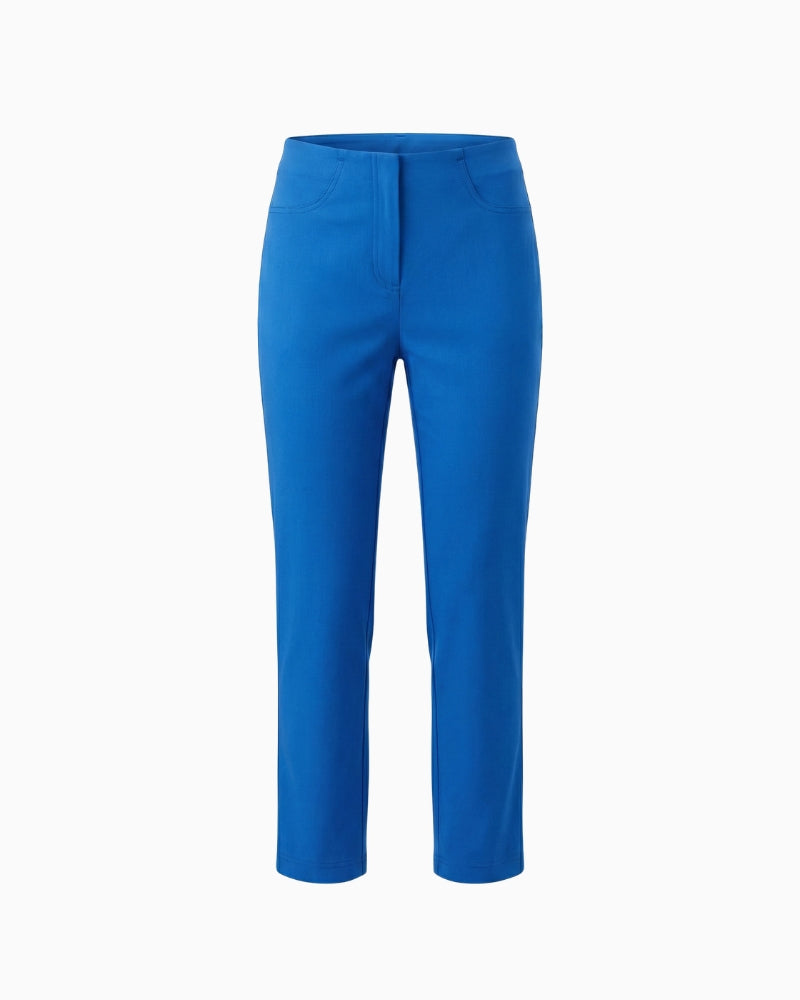 The Bella 09 trousers from Robell are a straight-leg ankle style made in a lightweight stretch fabric for easy, all-day comfort. The wide elastic waistband sits smoothly at the waist, offering pull-on ease without bulk. Designed with practical back pockets and subtle mock fly detail, they give a neat, polished look while staying comfortable. In blue, they add a fresh lift to your everyday wardrobe.