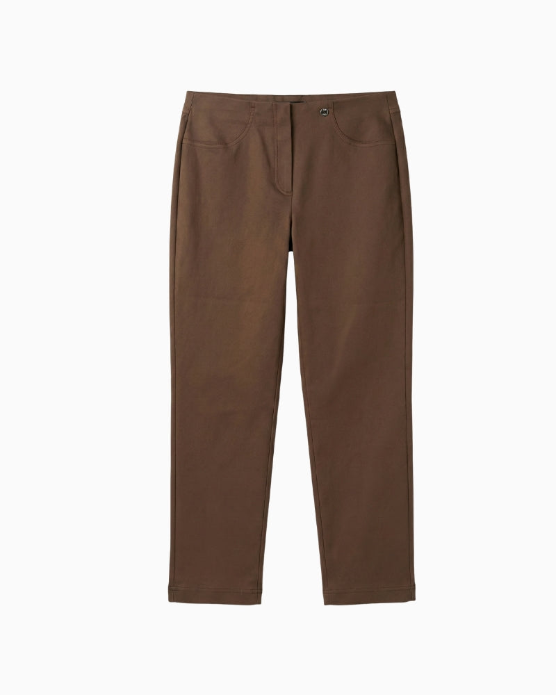 The Bella 18 ankle grazer from Robell is made in soft cotton sateen with a gentle sheen and comfortable stretch. The straight-leg shape gives a clean, balanced line, while the elasticated waistband offers easy pull-on comfort. Designed with rear pockets and subtle faux zip detail, they feel neat but relaxed. In light brown, they’re a lovely neutral for everyday wear, work or smarter occasions.