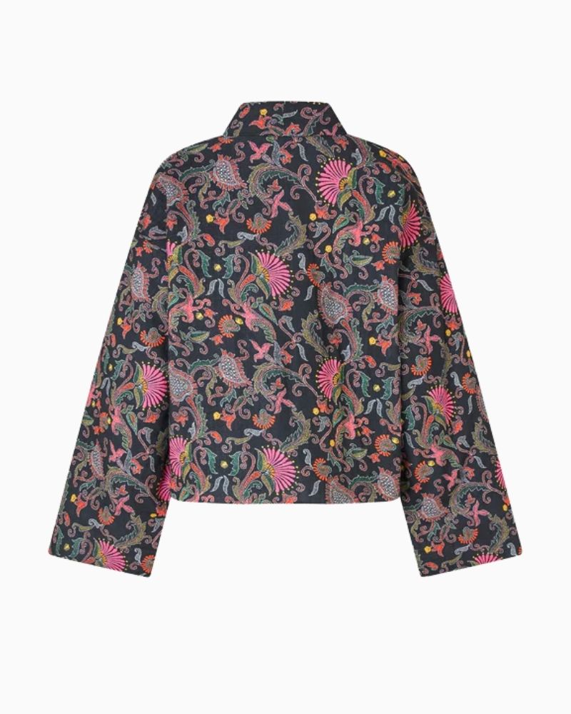 The Barbra jacket from Lollys Laundry is a bright little piece that’ll lift any outfit. Designed in a colourful paisley print on a dark base, it’s lightweight and unlined—ideal for layering as the seasons shift. The open front gives it a relaxed feel, while the straight cut and large patch pockets keep it practical. Whether you’re popping it over a tee, blouse, or even a knit, it brings a cheerful splash of colour without feeling fussy.