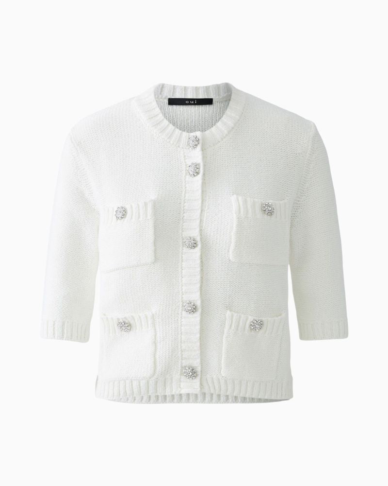 A stylish cropped layer that’s both soft and structured, the Cloud Dancer Cardigan from Oui is crafted in a textured cotton blend with a neat, tailored feel. Knitted with the inside-out effect for subtle texture, it features a round neck, decorative buttons, and four small patch pockets for a touch of detail. A lovely option to slip over dresses or wear with high-waisted trousers.